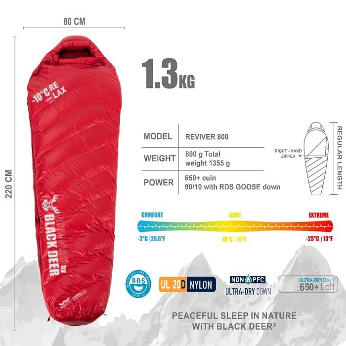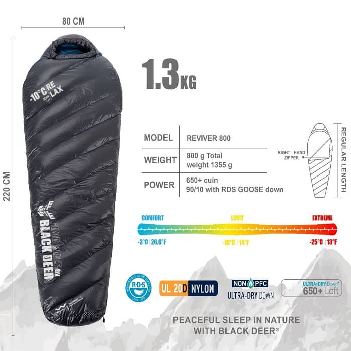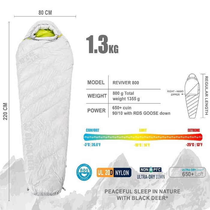 کیسه خواب بلک دیر مدل Reviver 800 یک کیسه خواب پر گرم و راحت برای استفاده در سه فصل است که برای کوهنوردی، کمپینگ و طبیعتگردی ایدهآل است. این کیسه خواب با پر غاز با کیفیت بالا پر شده و دارای پف شوندگی 650FP است که گرمای مطلوبی را در شبهای سرد به شما ارائه میدهد.