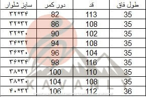 ابعاد زیر براساس اندازه گیری توسط کارشناس کاوانلی انجام شده و دقیقا از روی محصول برداشت شده است لذا براساس جدول و راهنمای زیر سایز محصول را انتخاب نمائید. توجه فرمائید خطای یک الی دو سانتی متر اجتناب ناپذیر می باشد.توجه دوم : کمرهای این شلوار حالت کشسانی دارد لذا اندازه های زیر در حالت عادی گرفته شده و به اندازه یک الی دو سانتی متر دور کمر می تواند افزایش داشته باشد.