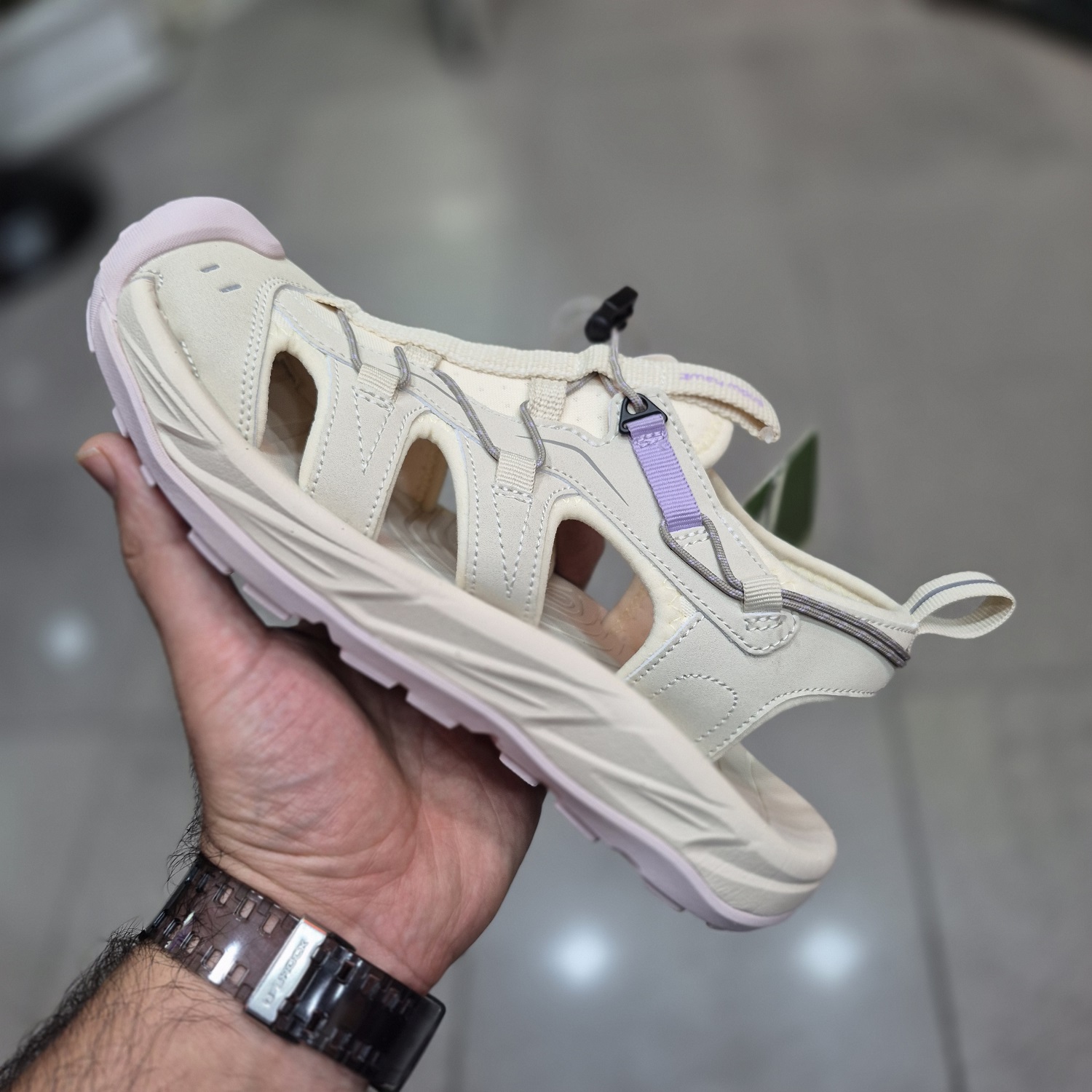 بسته شدن صندل با یک سیستم قوی و قابل تنظیم صورت میگیرد که به کاربر امکان میدهد صندل را با دقت و امنیت بیشتری بسته و تنظیم کند، از این رو به دلیل قابلیت تنظیم بودن، به راحتی با انواع پاها سازگار است.